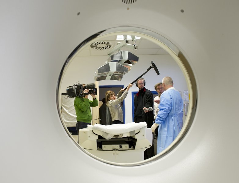 The documentary team from Danish Broadcasting Corporation (DR) at work in Prague, November 2010. With camera (r.) Lars Skov and presenter Lisbeth Jessen (with boom) recording the conversation between associate professor of Aarhus University, Jens Vellev, and doctor Martin Horak from the Homolka Hospital in Prague during the CT-scan of Tycho Brahe's skeleton. Also present a journalist from Czech radio. DR is issuing a documentary film on the entire Tycho Brahe-project in 2011.